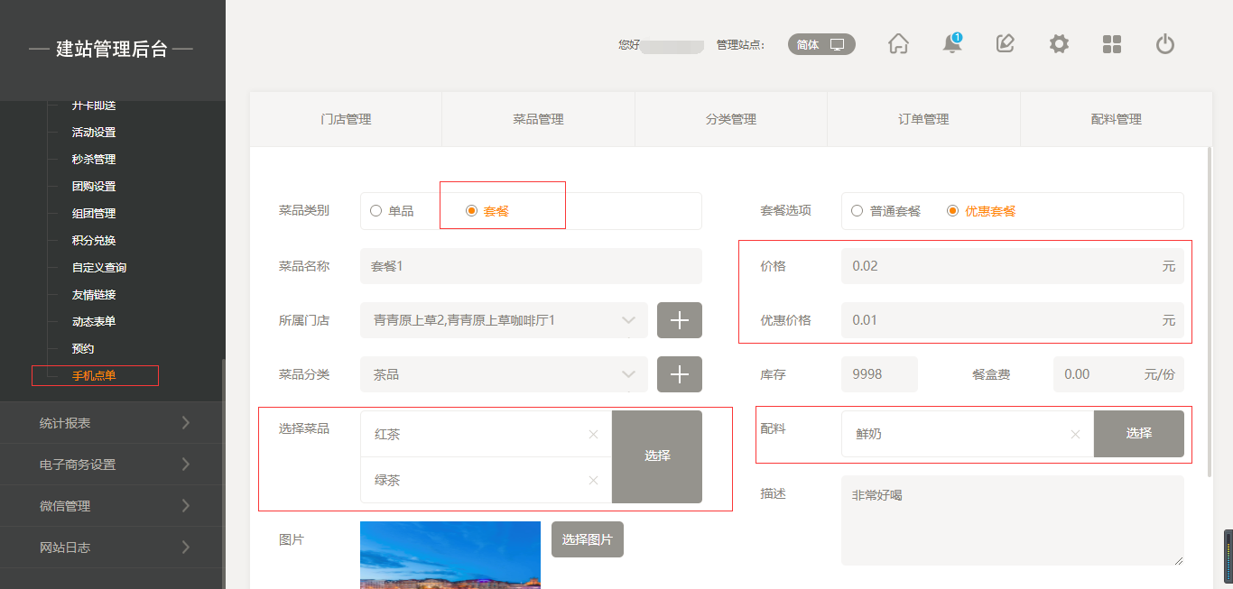 2.点击“菜品管理”添加菜品,添加菜品时有两种选项,一个是“单品”,另一个是“套餐”,当点击“套餐”时,我们选择之前添加好的单品进行组合即可;当添加菜品时,我们也可以给该菜品添加“口味”以及“配料”,同时我们也可以给该菜品进行“规格”设置,如“大杯”“小杯”等,在前端添加菜品时都会体现出来,填写完成后点击保存即可,如图所示: